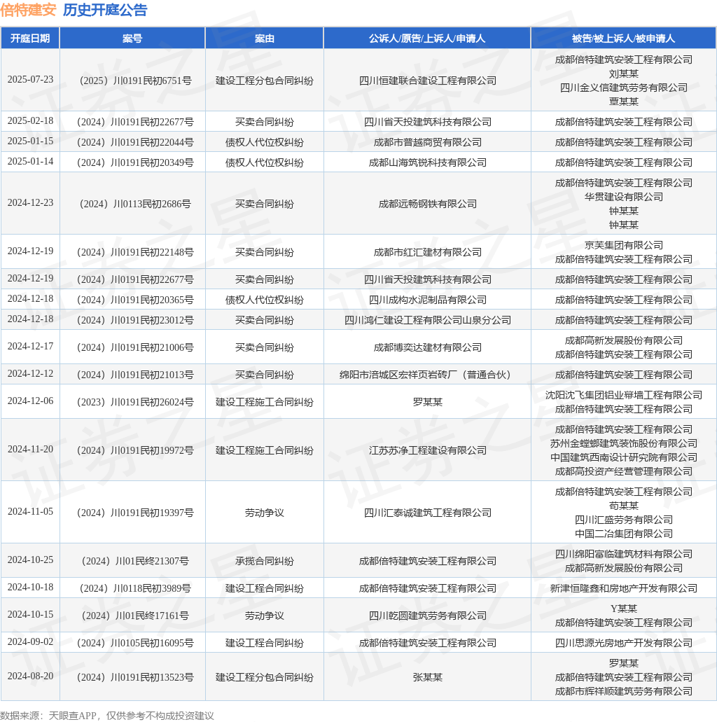 根据统计,近一年内以成都倍特建筑安装工程有限公司为当事人的历史开庭公告有19则,其中案由为“买卖合同纠纷”的公告以7则居首,其次为“债权人代位权纠纷”有3则,“劳动争议”有2则。历史开庭公告如下: