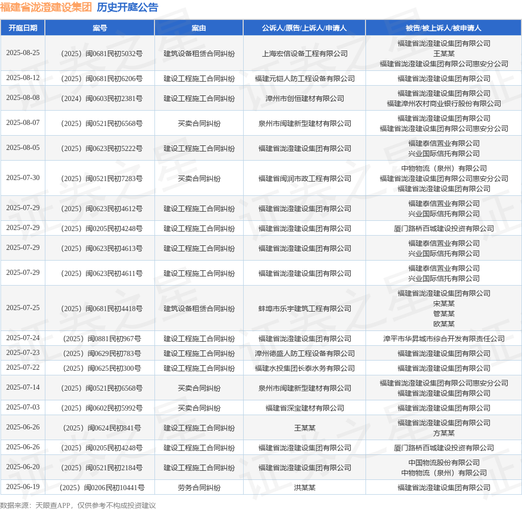 根据统计,近一年内以福建省泷澄建设集团有限公司为当事人的历史开庭公告有71则,其中案由为“建设工程施工合同纠纷”的公告以31则居首,其次为“劳务合同纠纷”有8则,“建筑设备租赁合同纠纷”有7则。历史开庭公告(前20条)如下: