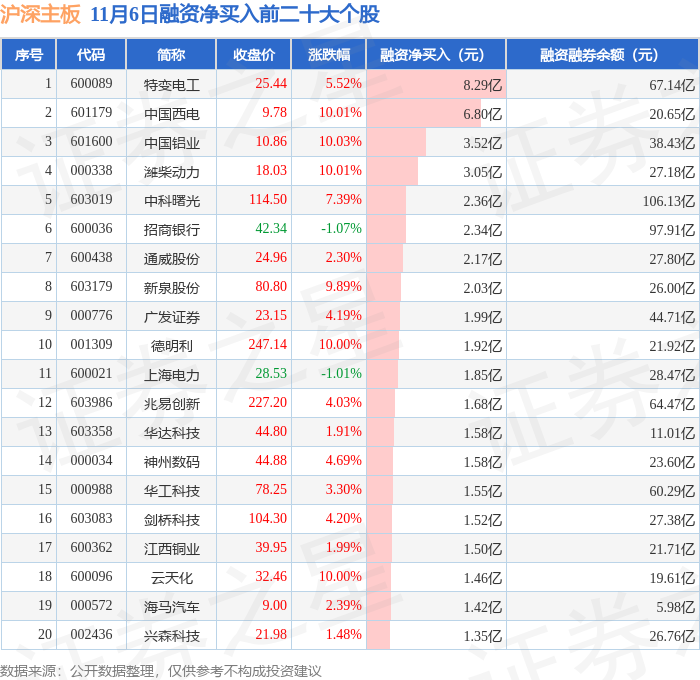 沪深主板融资净买入前三分别为:特变电工(600089)融资净买入8.29亿元、中国西电(601179)融资净买入6.8亿元、中国铝业(601600)融资净买入3.52亿元,前20具体见下表: