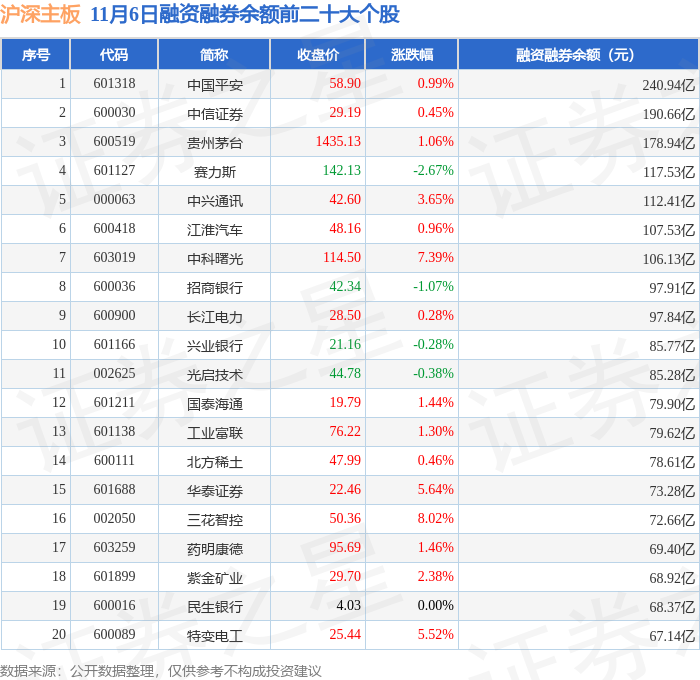 沪深主板融资融券余额前三分别为:中国平安(601318)融资融券余额240.94亿元、中信证券(600030)融资融券余额190.66亿元、贵州茅台(600519)融资融券余额178.94亿元,前20具体见下表: