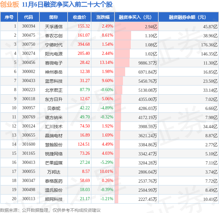 创业板融资净买入前三分别为:天孚通信(300394)融资净买入2.94亿元、香农芯创(300475)融资净买入1.1亿元、宁德时代(300750)融资净买入1.08亿元,前20具体见下表: