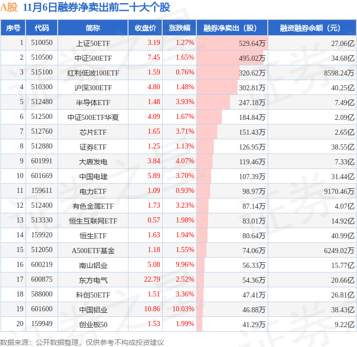 A股融券净卖出前三分别为:上证50ETF(510050)融券净卖出529.64万股、中证500ETF(510500)融券净卖出495.02万股、红利低波100ETF(515100)融券净卖出320.62万股,前20具体见下表: