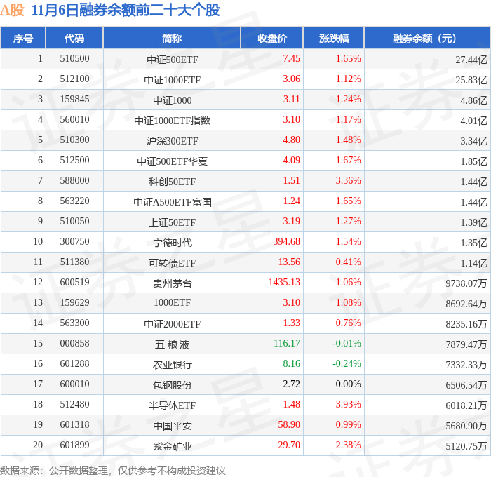 A股融券余额前三分别为:中证500ETF(510500)融券余额27.44亿元、中证1000ETF(512100)融券余额25.83亿元、中证1000(159845)融券余额4.86亿元,前20具体见下表: