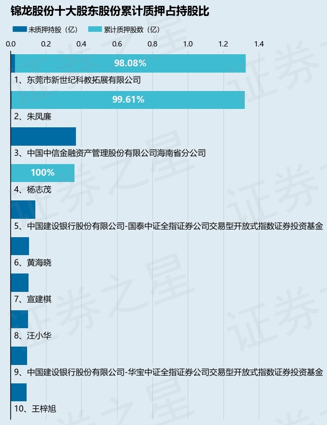 截止本公告日,股东东莞市新世纪科教拓展有限公司已累计质押股份1.3亿股,占其持股总数的98.08%,股东朱凤廉已累计质押股份1.32亿股,占其持股总数的99.61%,股东杨志茂已累计质押股份3600.0万股,占其持股总数的100.0%。本次质押后锦龙股份十大股东的累计质押股份占持股比例(占持股比例的计算以公司最新一期财务报表公布的十大股东的持股总数为基准)见下图: