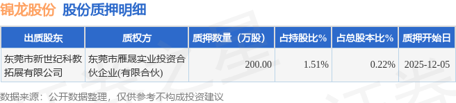 证券之星消息,锦龙股份(000712)12月9日公开信息显示,股东东莞市新世纪科教拓展有限公司向东莞市雁晟实业投资合伙企业(有限合伙)合计质押200.0万股,占总股本0.22%。质押详情见下表: