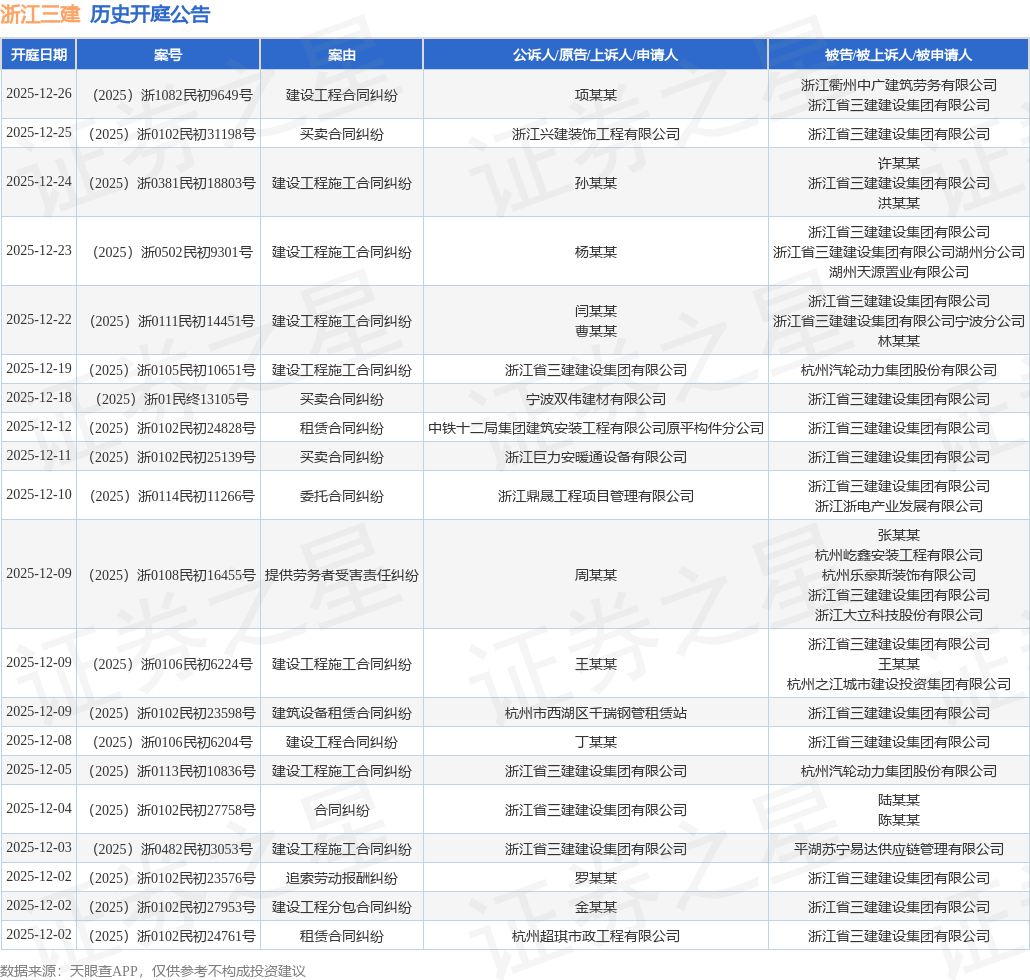 根据统计,近一年内以浙江省三建建设集团有限公司为当事人的历史开庭公告有238则,其中案由为“买卖合同纠纷”的公告以88则居首,其次为“建设工程施工合同纠纷”有51则,“建设工程分包合同纠纷”有19则。历史开庭公告(前20条)如下: