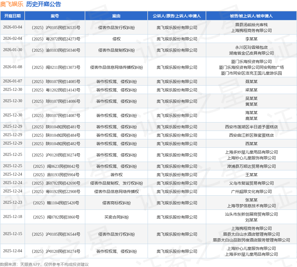 根据统计,近一年内以奥飞娱乐股份有限公司为当事人的历史开庭公告有344则,其中案由为“著作权权属、侵权纠纷”的公告以162则居首,其次为“侵害作品发行权纠纷”有54则,“侵害作品信息网络传播权纠纷”有27则。历史开庭公告(前20条)如下: