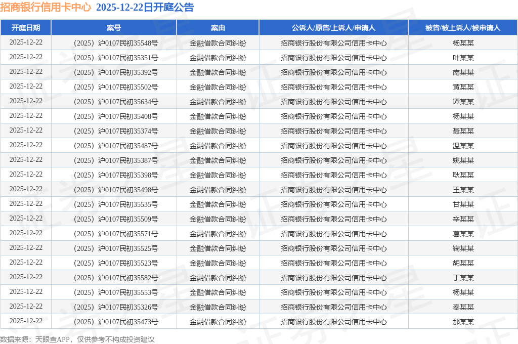 证券之星消息,根据天眼查APP显示,近日公布了33则招商银行股份有限公司信用卡中心作为原告/上诉人的开庭公告,案由为金融借款合同纠纷,开庭日期为2025年12月22日。详细内容如下(前20条):