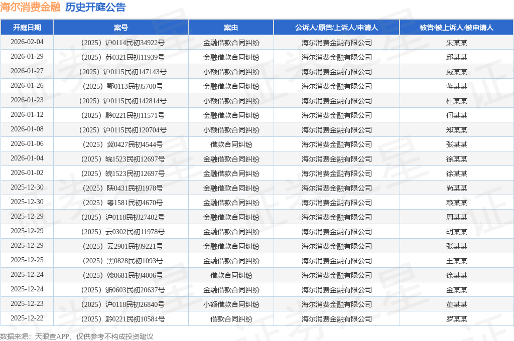 根据统计,近一年内以海尔消费金融有限公司为当事人的历史开庭公告有362则,其中案由为“金融借款合同纠纷”的公告以260则居首,其次为“借款合同纠纷”有56则,“小额借款合同纠纷”有31则。历史开庭公告(前20条)如下: