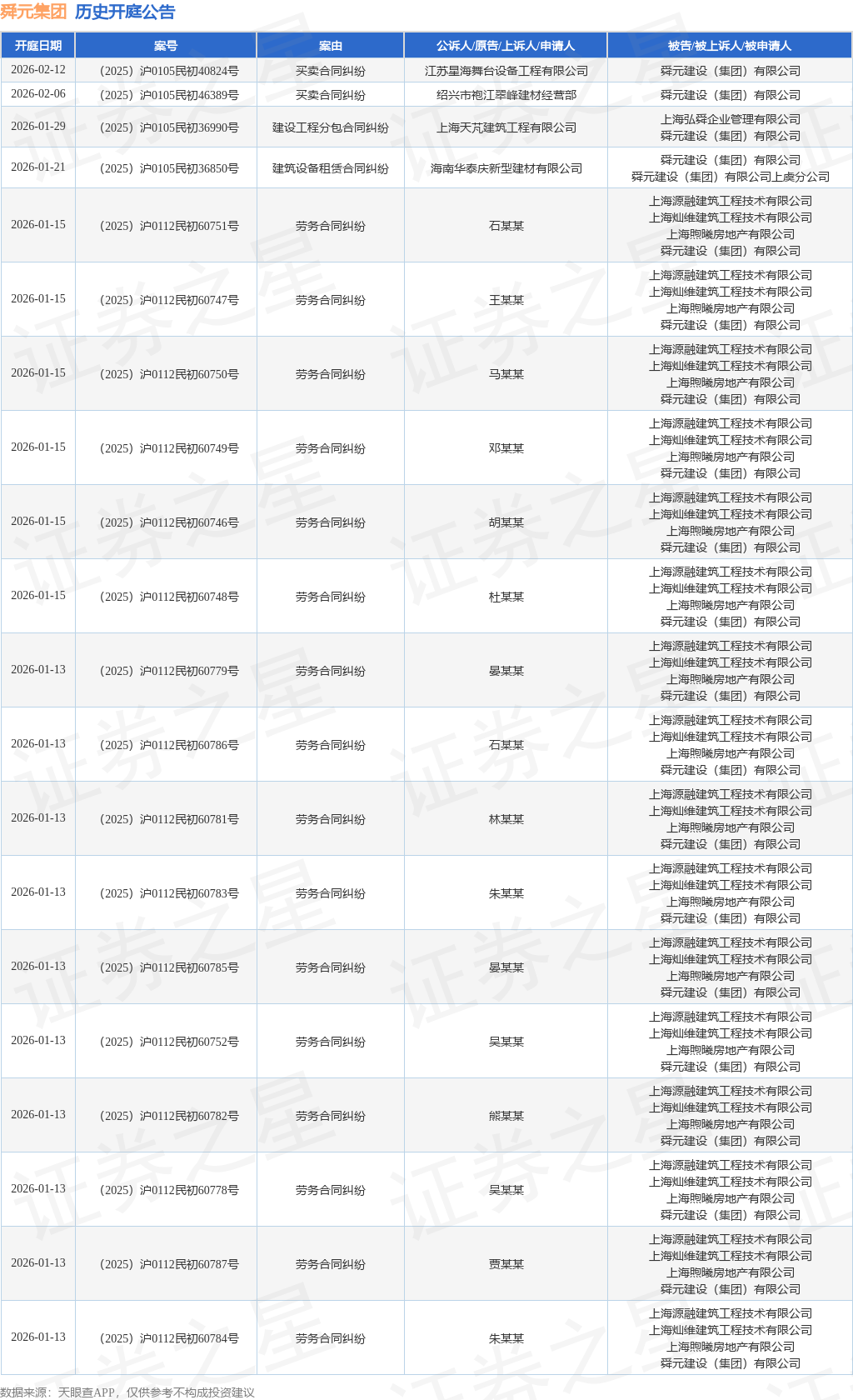根据统计,近一年内以舜元建设(集团)有限公司为当事人的历史开庭公告有234则,其中案由为“买卖合同纠纷”的公告以73则居首,其次为“劳务合同纠纷”有39则,“建设工程施工合同纠纷”有28则。历史开庭公告(前20条)如下: