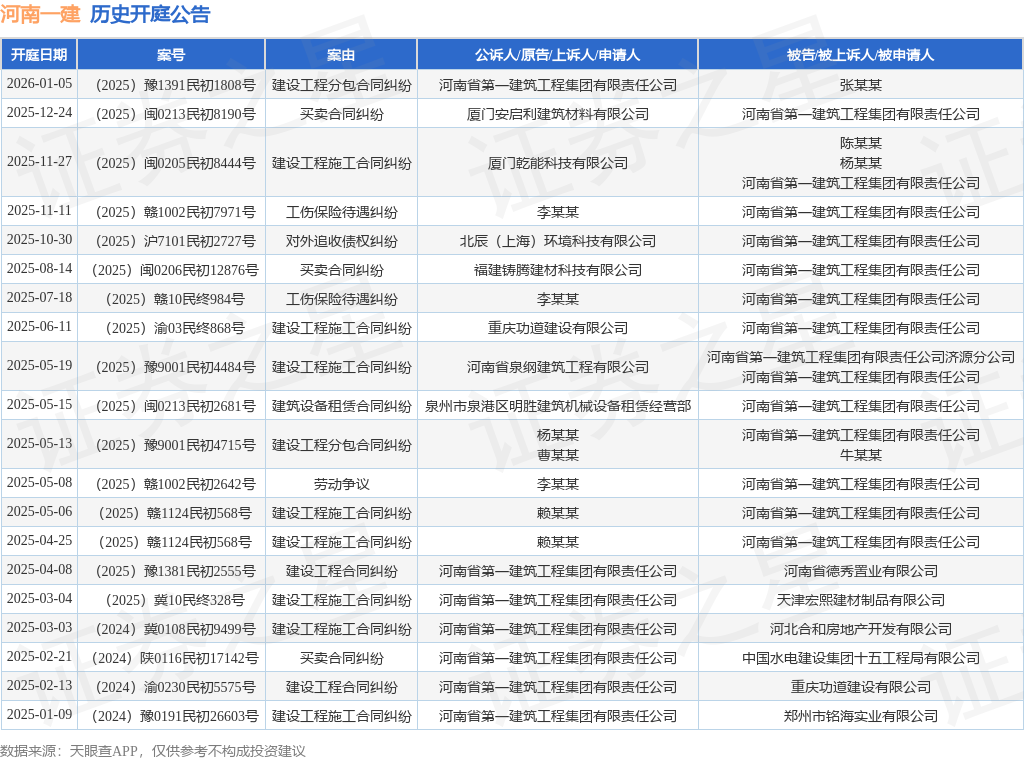 根据统计,近一年内以河南省第一建筑工程集团有限责任公司为当事人的历史开庭公告有27则,其中案由为“建设工程施工合同纠纷”的公告以9则居首,其次为“建设工程合同纠纷”有5则,“买卖合同纠纷”有3则。历史开庭公告(前20条)如下:
