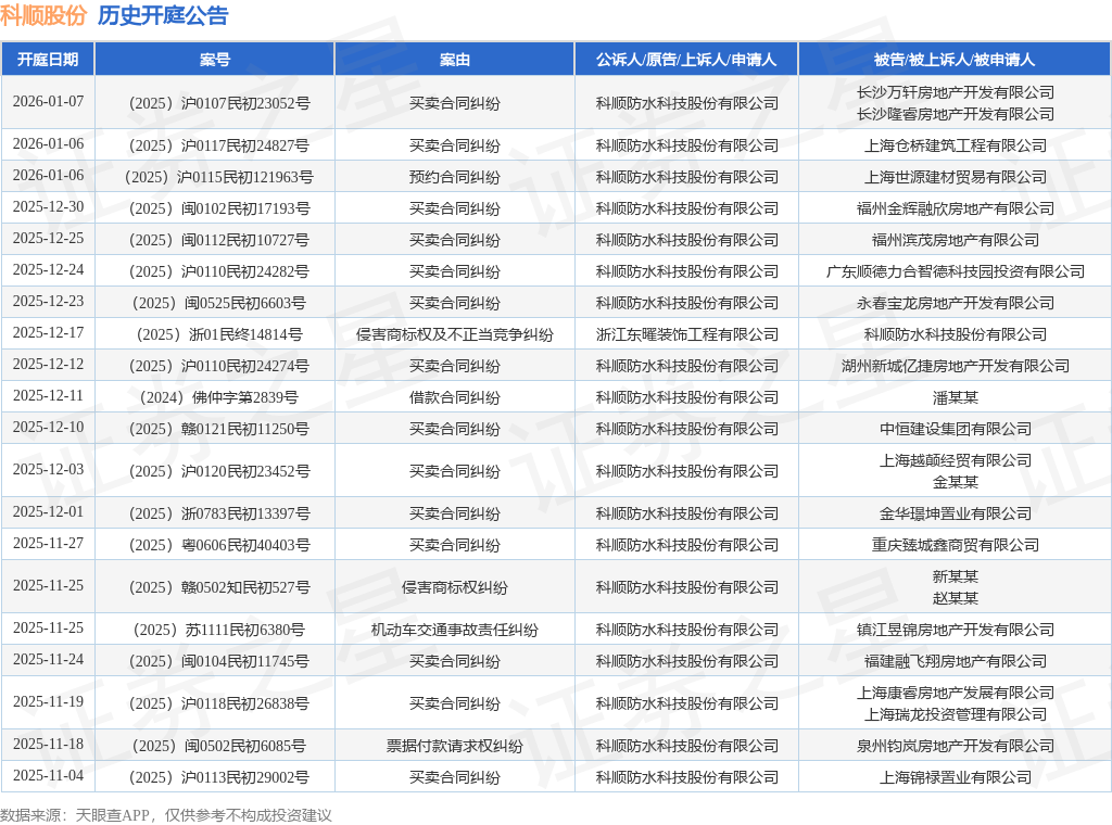 根据统计,近一年内以科顺防水科技股份有限公司为当事人的历史开庭公告有139则,其中案由为“买卖合同纠纷”的公告以96则居首,其次为“票据纠纷”有15则,“侵害商标权纠纷”有6则。历史开庭公告(前20条)如下: