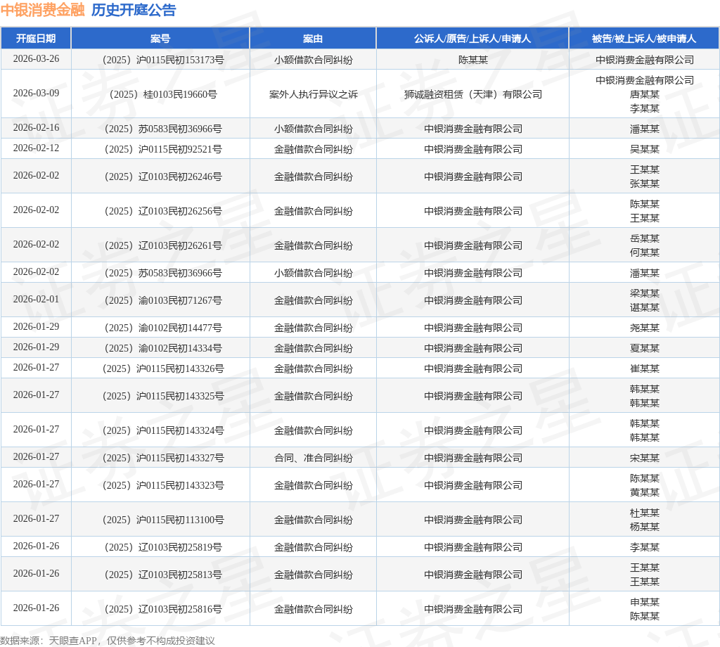 证券之星消息,根据天眼查APP显示,近日公布了一则中银消费金融有限公司作为被告/被上诉人的开庭公告,详细内容如下: